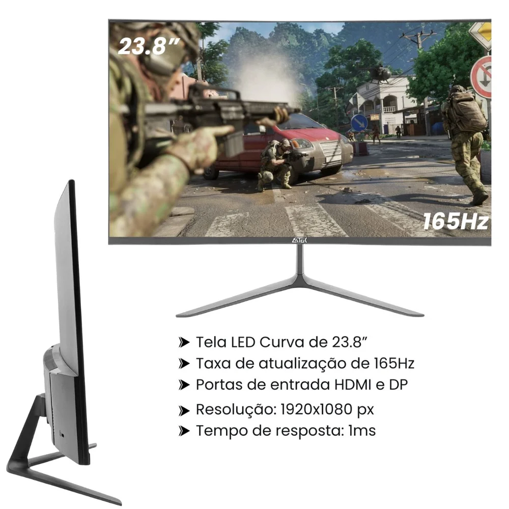 - Imersão Curva: Tela de 23,8″ com curvatura projetada para um campo de visão mais uniforme e envolvente.