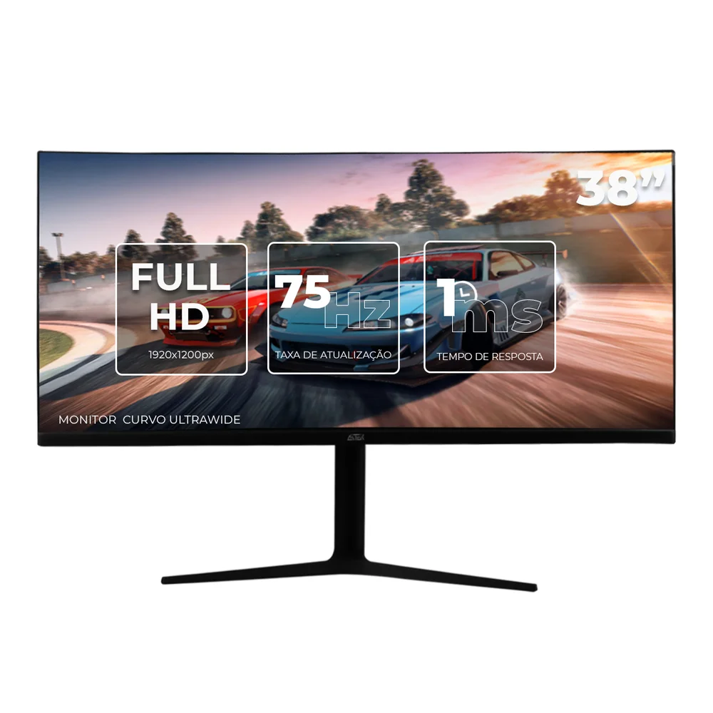 O monitor analisado é um periférico de saída de vídeo com dimensões expandidas, caracterizando-se pelo formato Ultrawide e uma diagonal de tela de 38 polegadas. O dispositivo utiliza um painel de tecnologia VA (Vertical Alignment), projetado para oferecer uma curvatura que visa mitigar a distorção visual em ângulos periféricos, comuns em telas de grande formato horizontal. O modelo opera com uma resolução máxima de 1920 x 1200 pixels, o que estabelece uma relação de aspecto voltada para o aumento da área de trabalho vertical e horizontal em comparação ao padrão Full HD convencional.