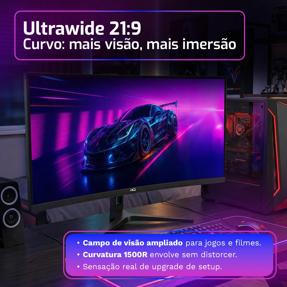 - ✅ Área de visualização 30% maior que monitores Full HD convencionais devido ao formato 21:9.