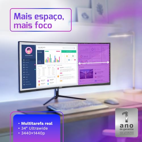 - Imersão Ultrawide QHD: Tela de 34″ com resolução 3440 x 1440 e proporção 21:9 para maior campo de visão e produtividade.