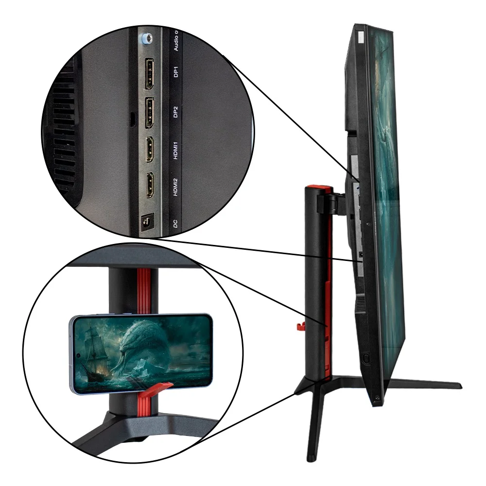 Estruturalmente, o dispositivo apresenta um chassi focado na versatilidade ergonômica, incluindo suporte para ajustes de altura, inclinação e rotação (pivot), permitindo a configuração em modo vertical. A conectividade é garantida por interfaces digitais modernas, sendo duas portas HDMI e duas portas DisplayPort, possibilitando a integração com múltiplos sistemas de entrada simultaneamente. O monitor também incorpora tecnologias de sincronização adaptativa, como FreeSync e G-Sync, essenciais para mitigar falhas de comunicação entre a unidade de processamento gráfico (GPU) e o painel.