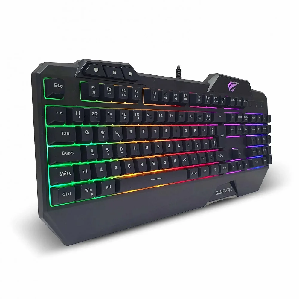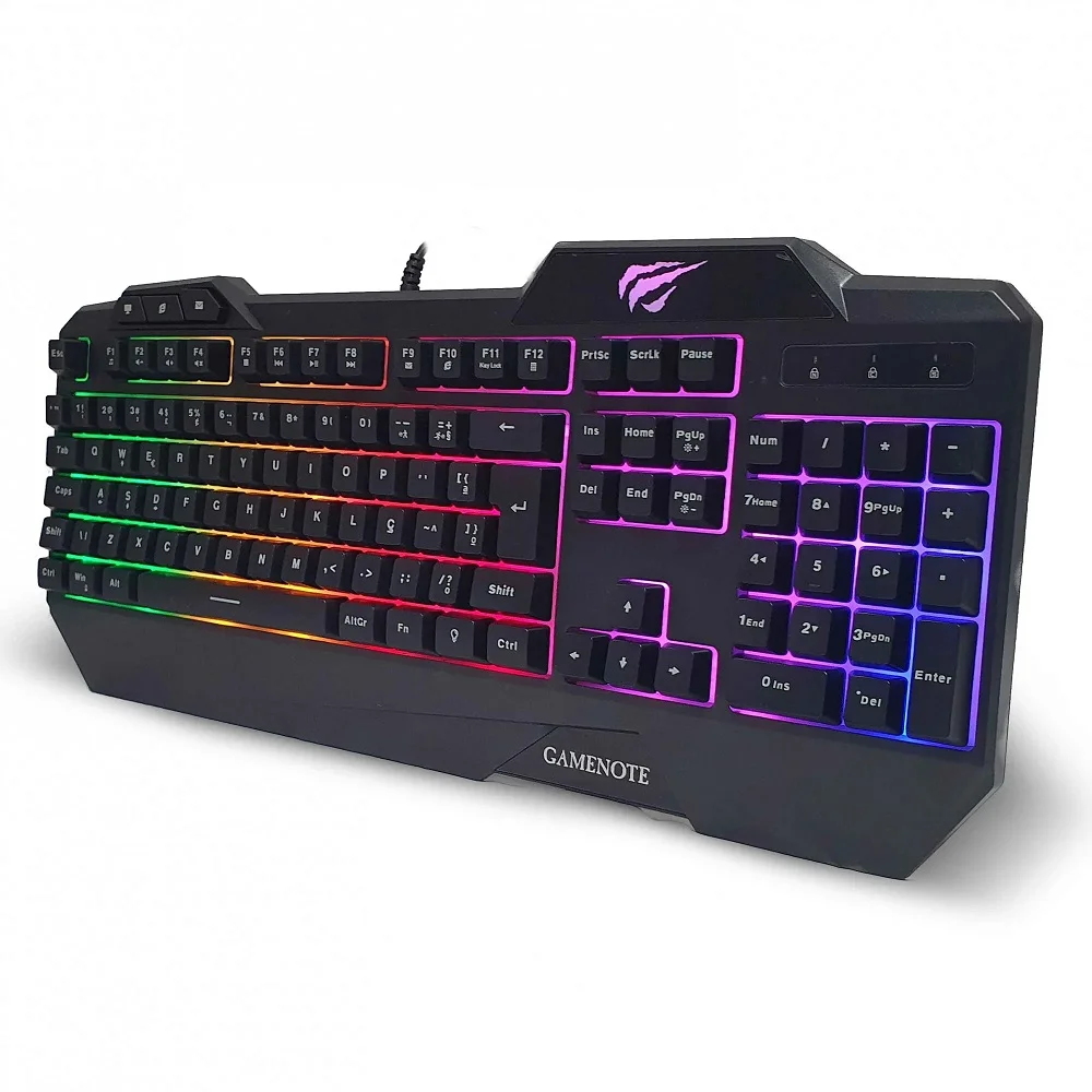O Havit KB488L é um periférico de entrada projetado para o segmento gamer, utilizando tecnologia de acionamento por membrana. O dispositivo apresenta um formato full-size, incluindo teclado numérico e uma zona superior dedicada a funções multimídia e atalhos de sistema. Sua construção é focada na ergonomia básica, apresentando uma extensão inferior do chassi que serve como apoio para os punhos. O sistema de retroiluminação é baseado em LEDs coloridos dispostos em zonas fixas, permitindo a visualização dos caracteres em ambientes escuros. Por ser um dispositivo Plug-and-Play, sua instalação é imediata via conexão USB, sem a necessidade de drivers proprietários ou softwares de configuração adicionais para o funcionamento das teclas padrão e de atalho.