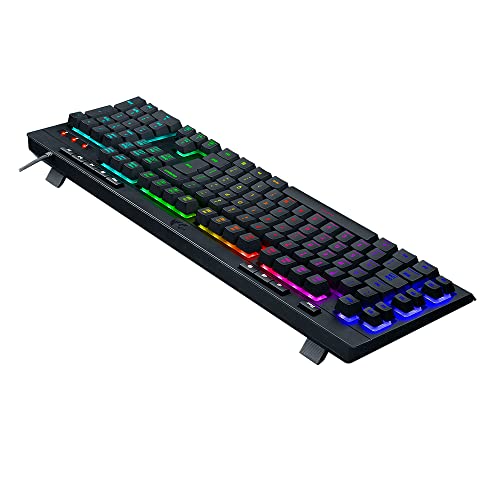 A estrutura do chassi possui um design de carcaça alta, o que confere maior robustez visual e estabilidade sobre a mesa de trabalho ou jogo. O acionamento é baseado em domos de borracha que exigem uma pressão de ativação padronizada, proporcionando um feedback tátil suave e silencioso. O modelo V2 destaca-se pela inclusão de um sistema de iluminação RGB distribuído em zonas, permitindo a visualização das teclas em ambientes de baixa luminosidade, e pela integração de um apoio de pulso magnético, um item de ergonomia focado na redução da fadiga do túnel do carpo durante sessões prolongadas de uso.
