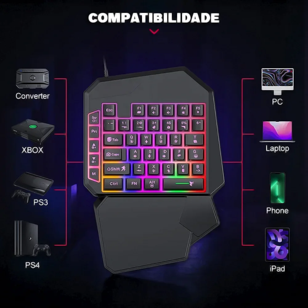 O Teclado Gamer Single Hand (Uma Mão) é um periférico especializado, desenvolvido para otimizar o desempenho em jogos de alta intensidade, como FPS (First Person Shooters) e MOBAs. Diferente dos teclados convencionais de layout completo, este dispositivo apresenta uma arquitetura reduzida que concentra apenas as teclas de comando essenciais para a mão esquerda, eliminando redundâncias e liberando área útil na superfície de trabalho para a movimentação do mouse.