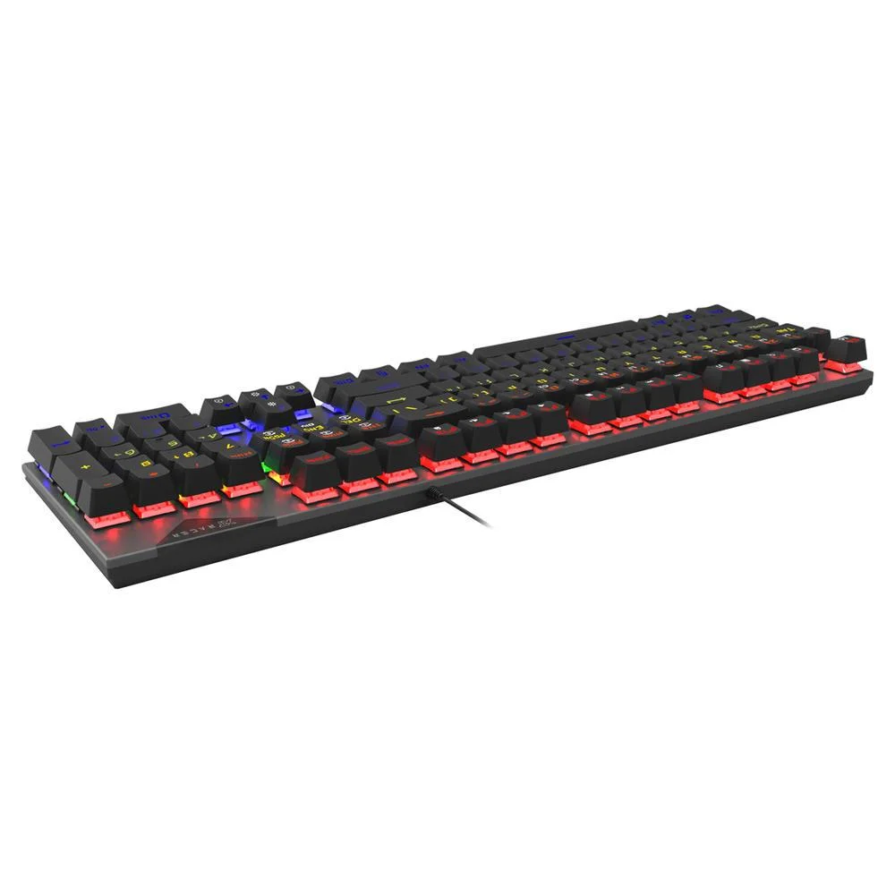 A construção externa é fundamentada em polímero ABS de alta densidade, apresentando uma base de 1 cm de espessura que visa manter a rigidez estrutural sem elevar excessivamente o peso total do periférico. O sistema de iluminação adota a tecnologia Rainbow, distribuindo cores fixas por zonas com efeitos dinâmicos de transição. No que tange à durabilidade, as keycaps são fabricadas pelo método de injeção dupla (Double-shot), técnica que funde duas camadas de plástico para garantir que as legendas não sofram desgaste ou apagamento sob fricção contínua. A conectividade é estabelecida via interface USB-A, utilizando um cabo revestido em fibra trançada para mitigar danos por torção ou abrasão.