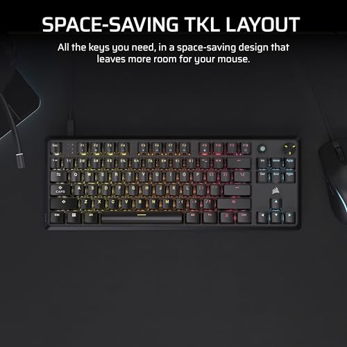 O Corsair K70 Core TKL é um teclado mecânico de alto desempenho projetado no formato Tenkeyless (TKL), que elimina o teclado numérico lateral para otimizar o espaço de trabalho e permitir maior amplitude de movimento para o mouse. O chassi é construído com uma combinação de placa superior de alumínio e base em plástico reforçado, integrando duas camadas de espuma EVA de alta densidade para o amortecimento de ruídos e vibrações. O coração do dispositivo são os switches lineares Corsair MLX Red v2, lubrificados de fábrica para garantir uma digitação suave e silenciosa. O modelo conta ainda com um botão rotativo multifuncional programável e iluminação RGB individual por tecla, totalmente gerenciável via software.