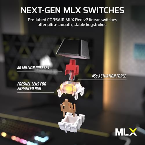 - ⭐ Switches Corsair MLX Red v2: Interruptores mecânicos lineares com lubrificação de fábrica, oferecendo uma força de atuação de 45g e durabilidade estendida para 80 milhões de acionamentos.