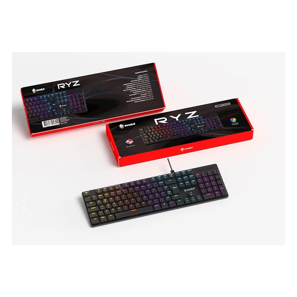 O Evolut RYZ EG222 é um periférico projetado para o segmento gamer que busca a integração entre a resposta tátil dos interruptores mecânicos e a ergonomia de dispositivos de perfil baixo (low profile). Este modelo se diferencia pela utilização de switches Red lineares, que oferecem um acionamento sem clique audível ou resistência tátil no ponto de ativação, características que favorecem a execução de comandos rápidos e repetitivos. Com uma estrutura construída em polímero de alta resistência, o teclado apresenta um chassi reduzido em altura, visando diminuir a angulação dos punhos durante o uso prolongado.
