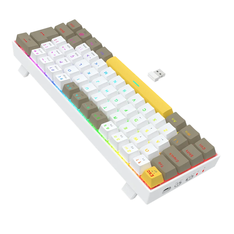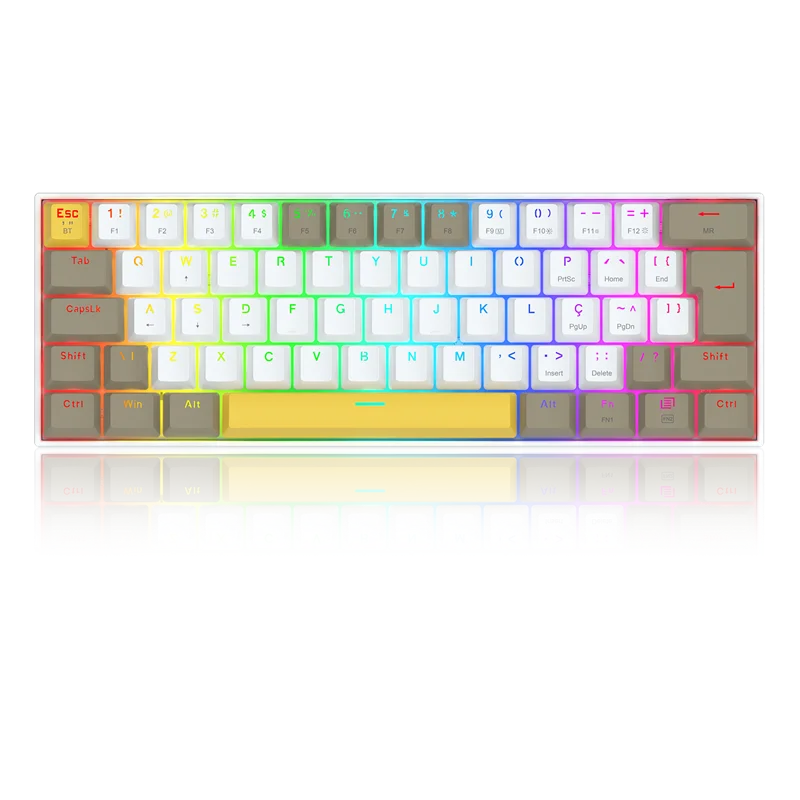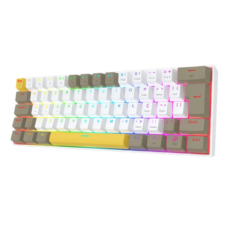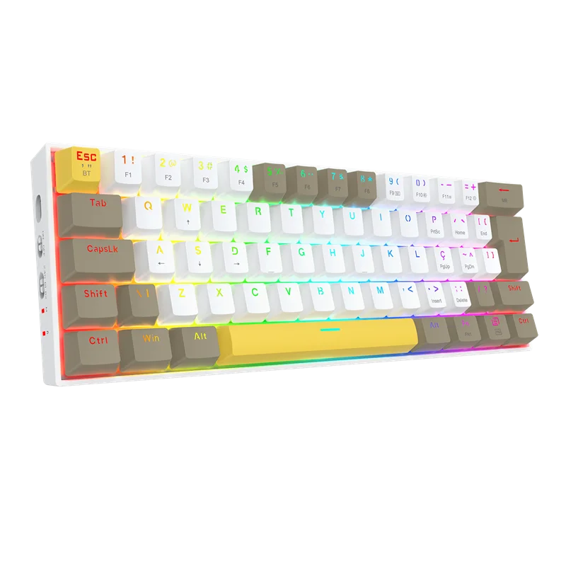 O Redragon Draconic Pro (K530-YL WT GY) é um teclado mecânico gamer de formato ultra-compacto (60%), projetado para usuários que priorizam a otimização de espaço na estação de trabalho ou setup de jogos. O dispositivo se diferencia pela estética tricolor, combinando os tons Branco, Cinza e Amarelo em suas keycaps, fugindo do padrão monocromático comum no segmento. Este modelo opera sob três modos de conectividade: cabeada via USB-C, sem fio através de rádio frequência 2.4 GHz e via Bluetooth, permitindo a transição entre múltiplos dispositivos de forma ágil.