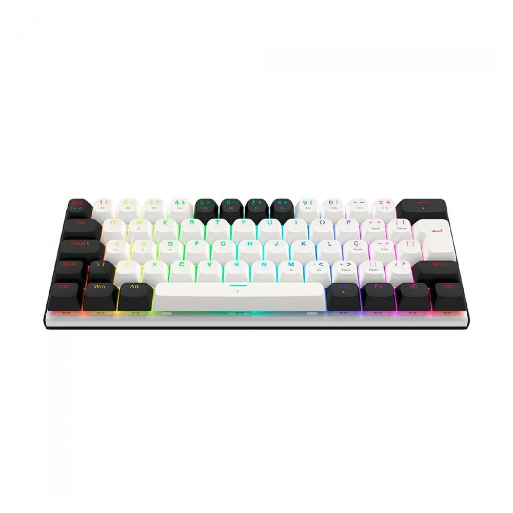 O Redragon Fidd (K683BW-RGB PT) é um teclado mecânico de alto desempenho projetado com foco em usuários que demandam máxima velocidade de resposta e economia de espaço. Operando sob o formato 60%, este periférico elimina as teclas numéricas e de função dedicadas para reduzir a pegada sobre a mesa, favorecendo a movimentação do mouse em setups competitivos. O chassi é construído em plástico ABS reforçado, apresentando uma estética bicolor em branco e preto.