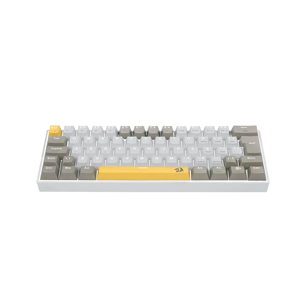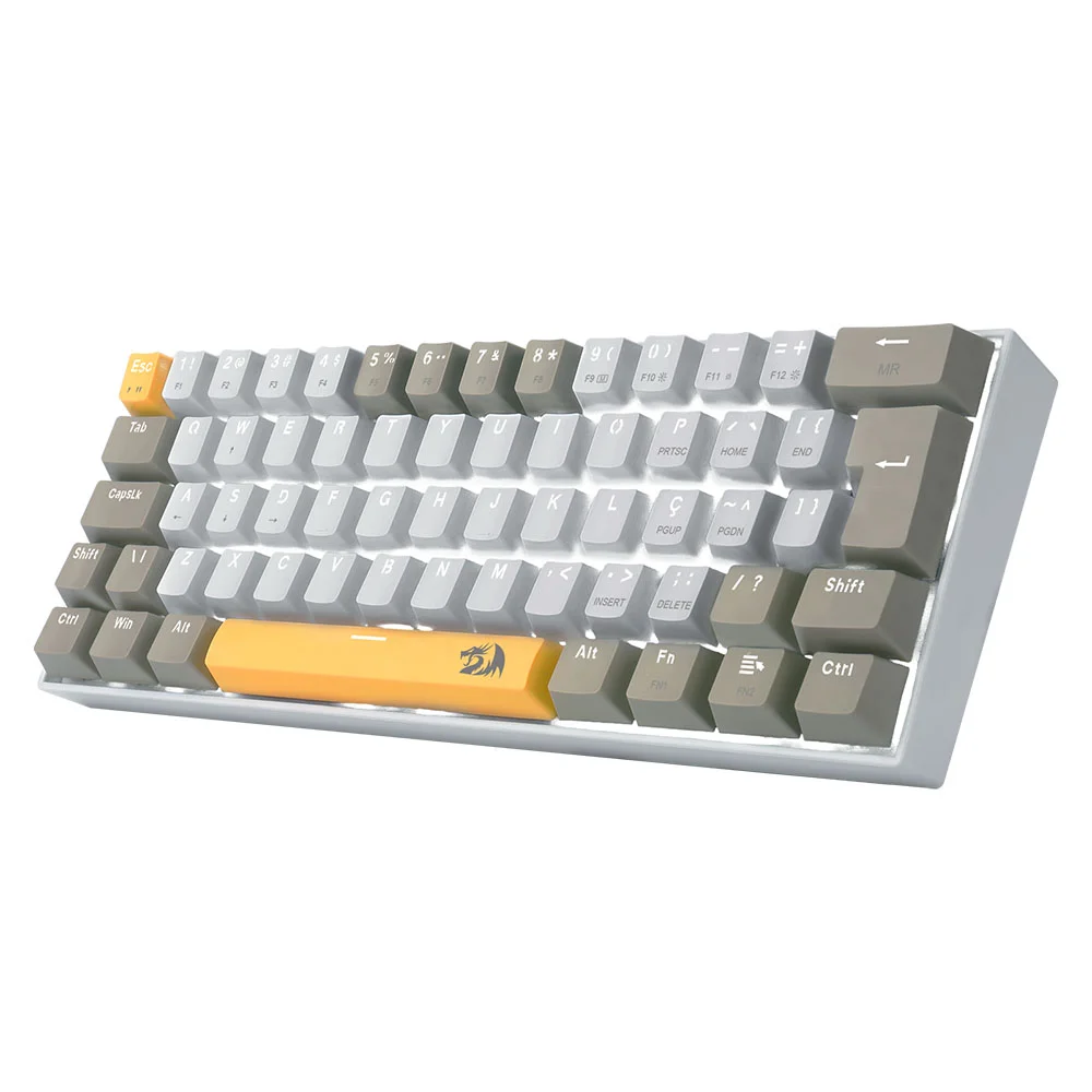 O Redragon Lakshmi Daylight é um teclado mecânico de formato ultra-compacto (60%), projetado especificamente para otimizar a área de trabalho e facilitar a portabilidade. Este periférico utiliza o layout brasileiro ABNT2, integrando a tecla “Ç” e a disposição padrão de símbolos da língua portuguesa, o que é atípico em dispositivos desta categoria de tamanho. O modelo foca em minimalismo funcional, eliminando o bloco numérico, as teclas de navegação e a fileira de funções superiores para reduzir as dimensões físicas ao mínimo necessário para a operação.