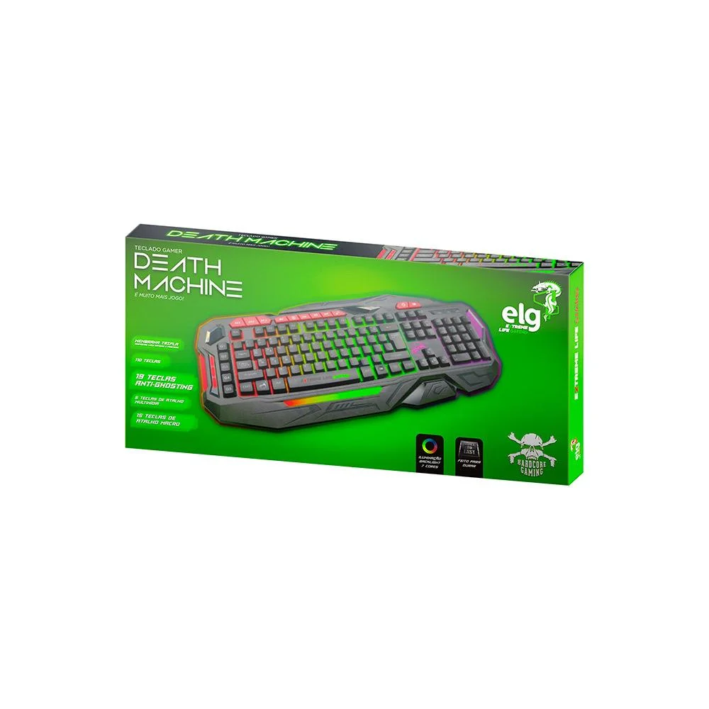 O Teclado Gamer ELG Death Machine (TGDM) é um periférico de entrada estruturado em um sistema de membrana tripla, projetado para oferecer uma resposta tátil mais firme e estável em comparação com teclados convencionais de escritório. O dispositivo é construído com foco em durabilidade, utilizando o conceito de “Military Grade Construction” para suportar sessões de uso prolongado. Com um layout expandido de 120 teclas no padrão ABNT2, o modelo integra funcionalidades específicas para automação, como teclas macro configuráveis diretamente no hardware, eliminando a dependência de software proprietário para funções básicas de personalização. Sua arquitetura prioriza a ergonomia através de um descanso de pulso integrado de borda larga, visando reduzir a fadiga durante a digitação ou jogabilidade.